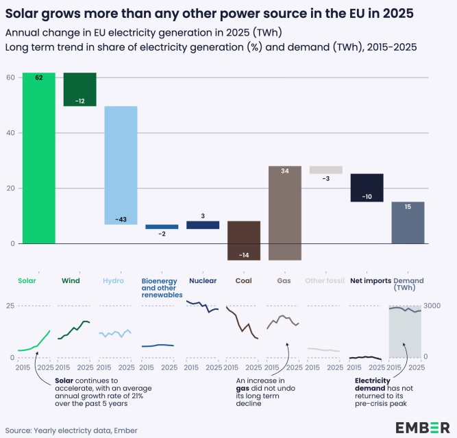 En 2025, les filières éolienne et solaire ont généré 841 TWh de l'UE (soit 30,1 % de la production totale d'électricité dans cette zone, contre 19,7 % en 2020) tandis que les énergies fossiles ont produit 809 TWh (29 % du mix, contre 36,7 % en 2024), selon les dernières données d'Ember.