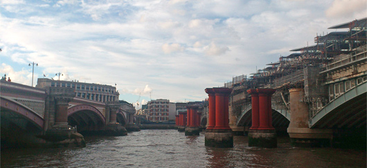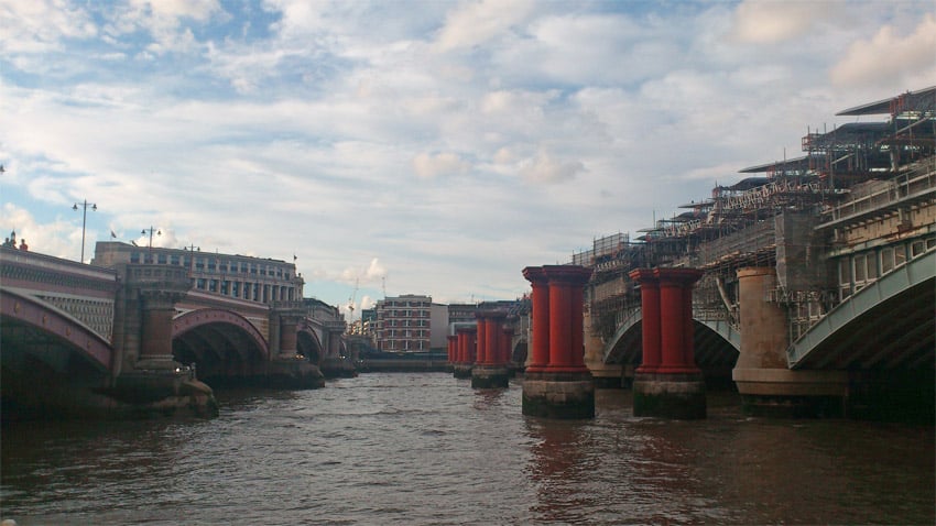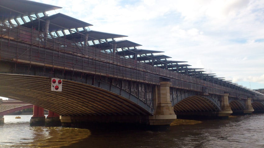 Ouvert en 1886, le Blackfriars Railway Bridge est actuellement en travaux dans le cadre du Thameslink Programme. (©2012)