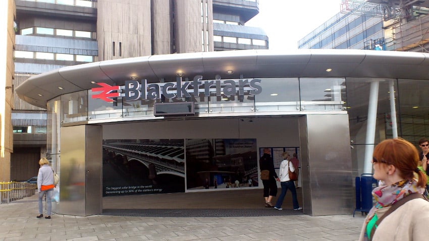 Au-dessus de la Tamise, le pont de la station de transports de Blackfriars est sur le point de devenir le plus grand pont solaire au monde. Près de 4 400 panneaux photovoltaïques, d’une puissance cumulée de 1,1 MW finissent d’être installés sur son toit par la société Solarcentury.