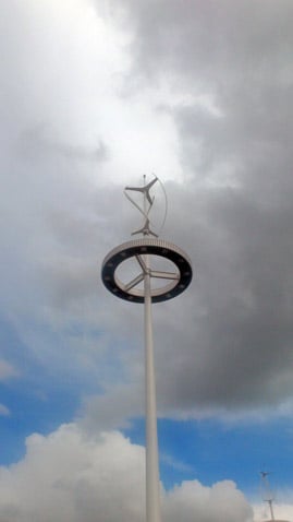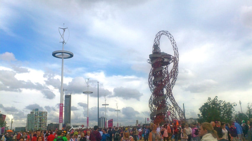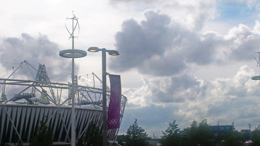 Autour du stade olympique, 7 turbines à axe vertical de type « qr5 » accueillent athlètes et spectateurs. Fabriquées par le groupe britannique quietrevolution, elles ont une puissance unitaire de 8 kW et peuvent produire jusqu’à 7 500 kWh par an quand le vent atteint des pics de 7 m/s selon le constructeur. Le coût de chacune de ces éoliennes, atteignant 40 000 livres sterling (près de 50 000 euros), devrait être amorti au bout de 12 ans.