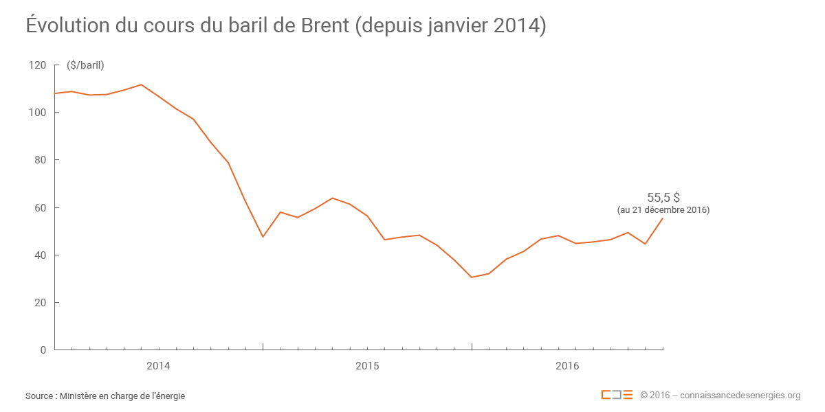 Ces baisses conjointes de production devraient accélérer le rééquilibrage entre l’offre et de la demande sur les marchés pétroliers. Suite à l’annonce de ces deux accords, les cours du brut sont remontés au-dessus de la barre des 50 $ par baril. Le cours du baril de Brent atteignait 55,5 $ au 21 décembre 2016(2), contre 30,7 $ en moyenne en janvier 2016.