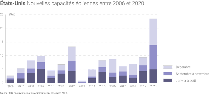 Rappelons que les États-Unis restent, avec la Chine, de loin le premier marché au monde pour l’éolien terrestre : ces deux pays ont compté pour plus de 60% des nouvelles capacités éoliennes terrestres installées dans le monde en 2019.