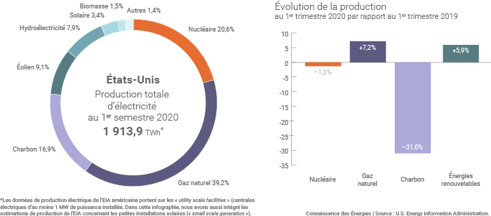 Au 1er semestre 2020, la production américaine d’électricité d’origine renouvelable a pour sa part augmenté de 5,9% par rapport à la même période en 2019. (©Connaissance des Énergies, d’après EIA)