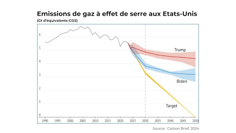 D’après les évaluations indépendantes, les États-Unis ne sont pas en ligne pour atteindre l’objectif de réduction des émissions de GES, au titre de leur contribution à l’accord de Paris (-50/52 % entre 2005 et 2030). Des mesures complémentaires auraient du compléter l’Inflation Reduction Act (IRA), principal outil de financement de la transition énergétique adopté sous l’administration Biden pour y parvenir.