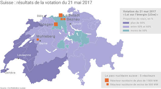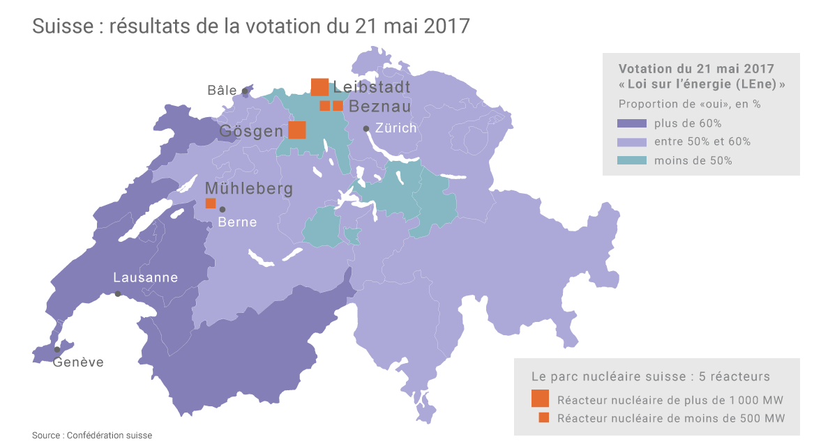 Le canton d’Argovie, où sont implantées les centrales nucléaires de Beznau et Leibstadt, a voté à 51,8% contre la nouvelle loi sur l’énergie. Cette dernière a en revanche été approuvée à 72,5% par le canton de Genève. (©Connaissance des Énergies)