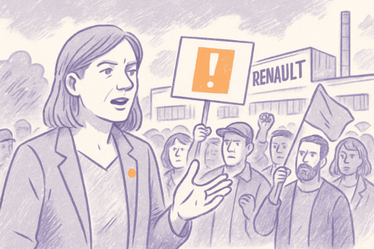 "On est ici aujourd'hui pour interpeller la direction de Renault et pour lui dire que les doubles discours ça suffit", a déclaré la secrétaire générale de la CGT, Sophie Binet.