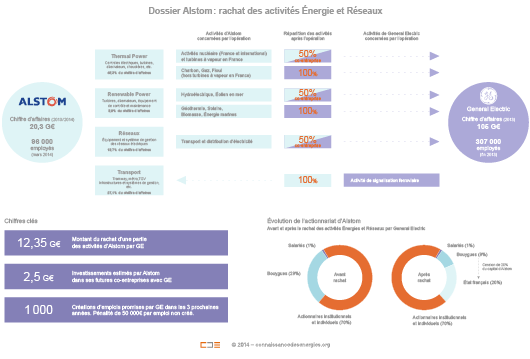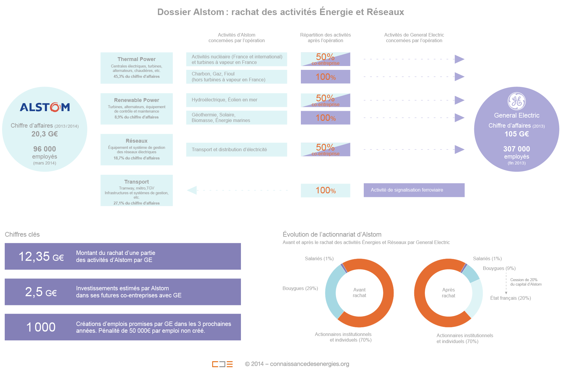 Jeudi 24 avril 2014, General Electric fait part publiquement de son intérêt pour les activités d’Alstom liées à l’énergie. Le géant américain a un chiffre d’affaires plus de 5 fois supérieur à celui d’Alstom et des activités très variées : eau, énergie, aéronautique, médical, éclairage, finance, etc. Il dit être prêt à investir de l’ordre de 10 milliards d’euros pour racheter la branche énergie d’Alstom, dont le chiffre d’affaires avoisine 15 milliards d’euros en 2013.