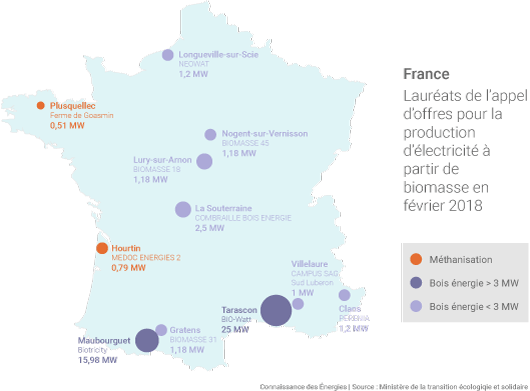 L’appel d’offres lancé en février 2016 sur la réalisation et l’exploitation d’installations productrices d’électricité à partir de biomasse est structuré en trois grandes périodes de candidature (sur 3 ans), portant chacune sur près de 60 MW de capacités, avec deux catégories : les installations utilisant le bois énergie comme combustible (de 300 kW à 25 MW de puissance(1)) et les projets de méthanisation(2).