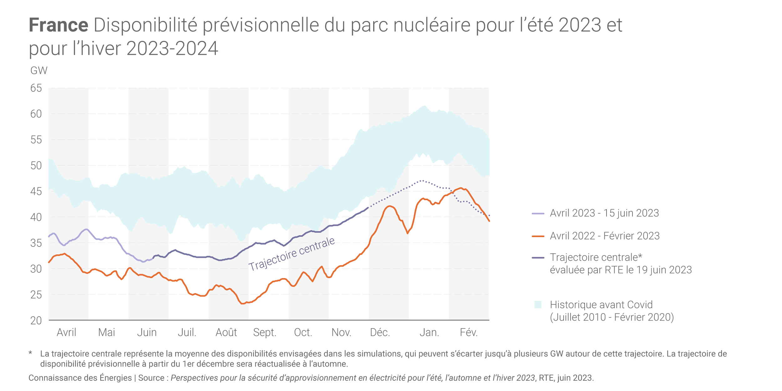 - la hausse de la disponibilité prévisionnelle du parc nucléaire (au moins jusqu'à janvier 2024), qui avait été « considérablement affectée par les défauts de corrosion » en 2022 (production de 279 TWh, contre 402 TWh par an moyenne au cours des 20 années précédentes), et qui « suscite moins d’incertitudes pour l’hiver ».