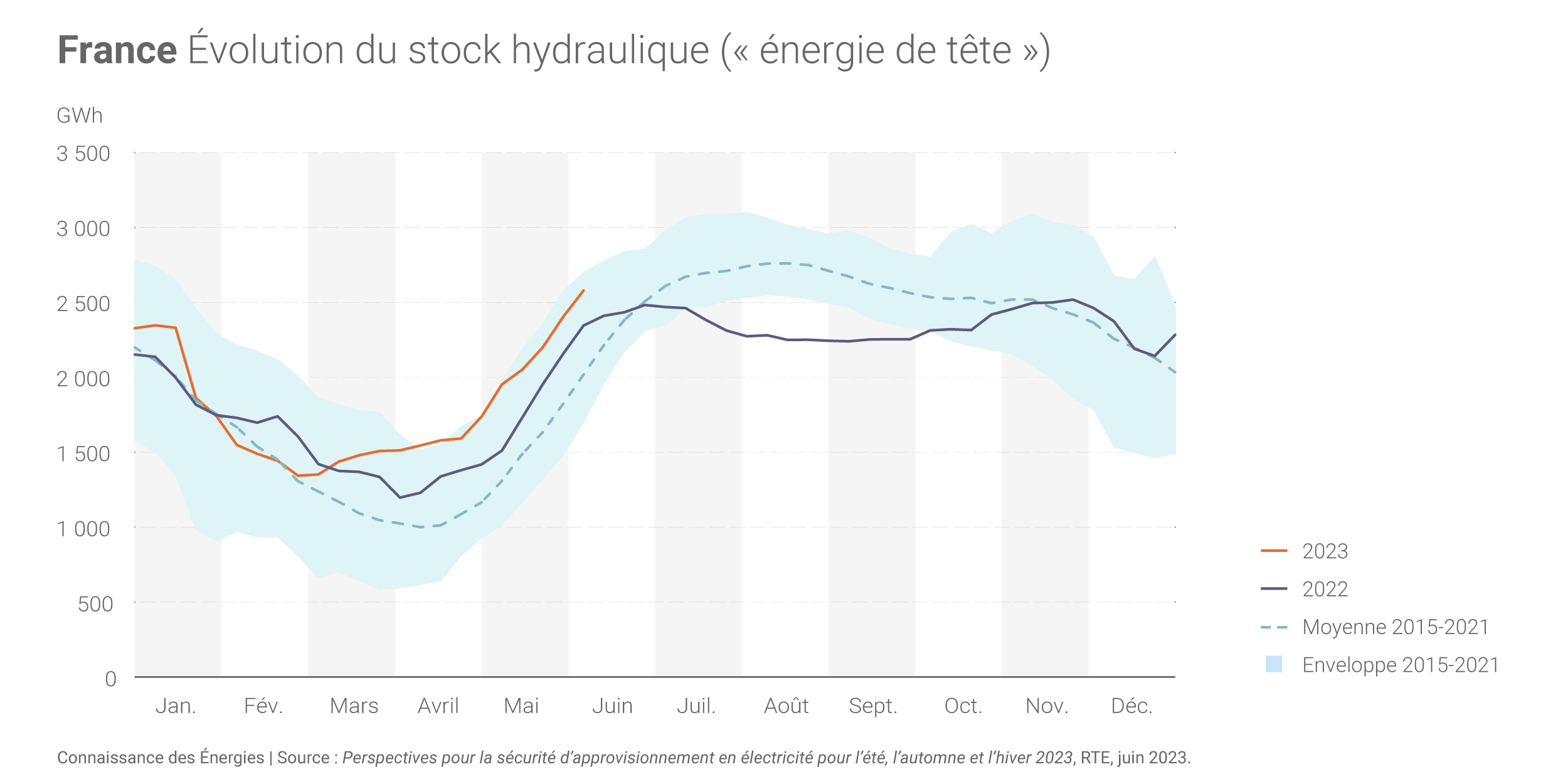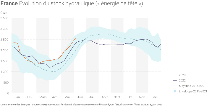 À cela s'ajoutent la poursuite du développement des filières renouvelables (la production cumulée des filières éolienne et photovoltaïque a notamment dépassé 18 TWh au 1er trimestre 2023, ce qui constitue une hausse de près de 4 TWh par rapport à la même période en 2022) et un bon niveau de remplissage des stocks hydrauliques (malgré la vague de sécheresse début 2023, notamment grâce à une « gestion prudente ») et gaziers.