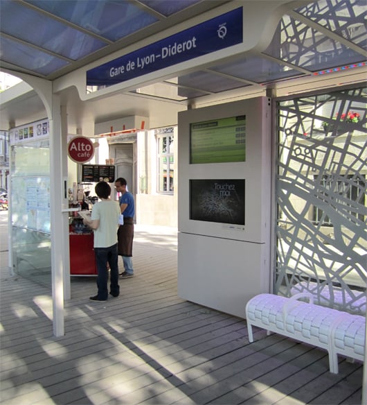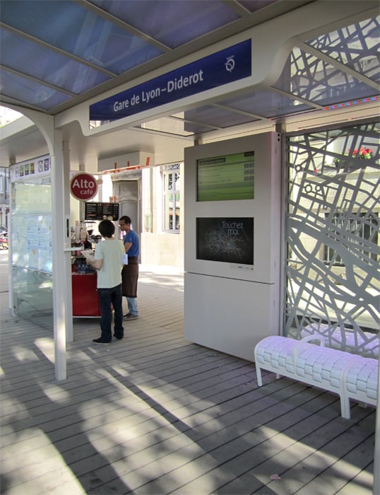 Conçue par l’architecte-designer Marc Aurel, la station de bus du 17 boulevard Diderot sert de « démonstrateur de recherche ». Une combinaison de nouveaux services y sont expérimentés afin de préparer les arrêts de bus de demain.