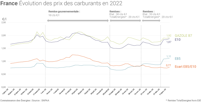 La filière du bioéthanol a certes « subi l’augmentation des coûts agricoles et des prix de l’énergie, en particulier du gaz » mais le prix à la pompe du superéthanol E85 reste l'atout central de ce carburant : au 20 janvier 2023, « le prix au litre observé à la pompe pour le Superéthanol E85 est de 1,11€ en moyenne [...] 76 centimes de moins par litre que le SP95-E10 vendu 1,87€ en moyenne ».