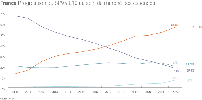 Le SP95-E10, communément appelé « E10 » (E pour éthanol) est l'essence la plus consommée en France depuis 2017. En 2022, ce carburant qui contient jusqu’à 10% d’éthanol(1) (jusqu'à 7,5% pour le SP95 et le SP98) a compté pour 56% de la consommation d'essences (57,9% en décembre 2022), contre 51,3% en 2021.