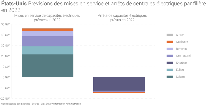 L’EIA indique par ailleurs que les exploitants de centrales électriques lui ont communiqué leur intention d’arrêter près de 14,9 GW d'installations en 2022. Ces arrêts prévus concernent pour 85% des centrales à charbon (12,6 GW).