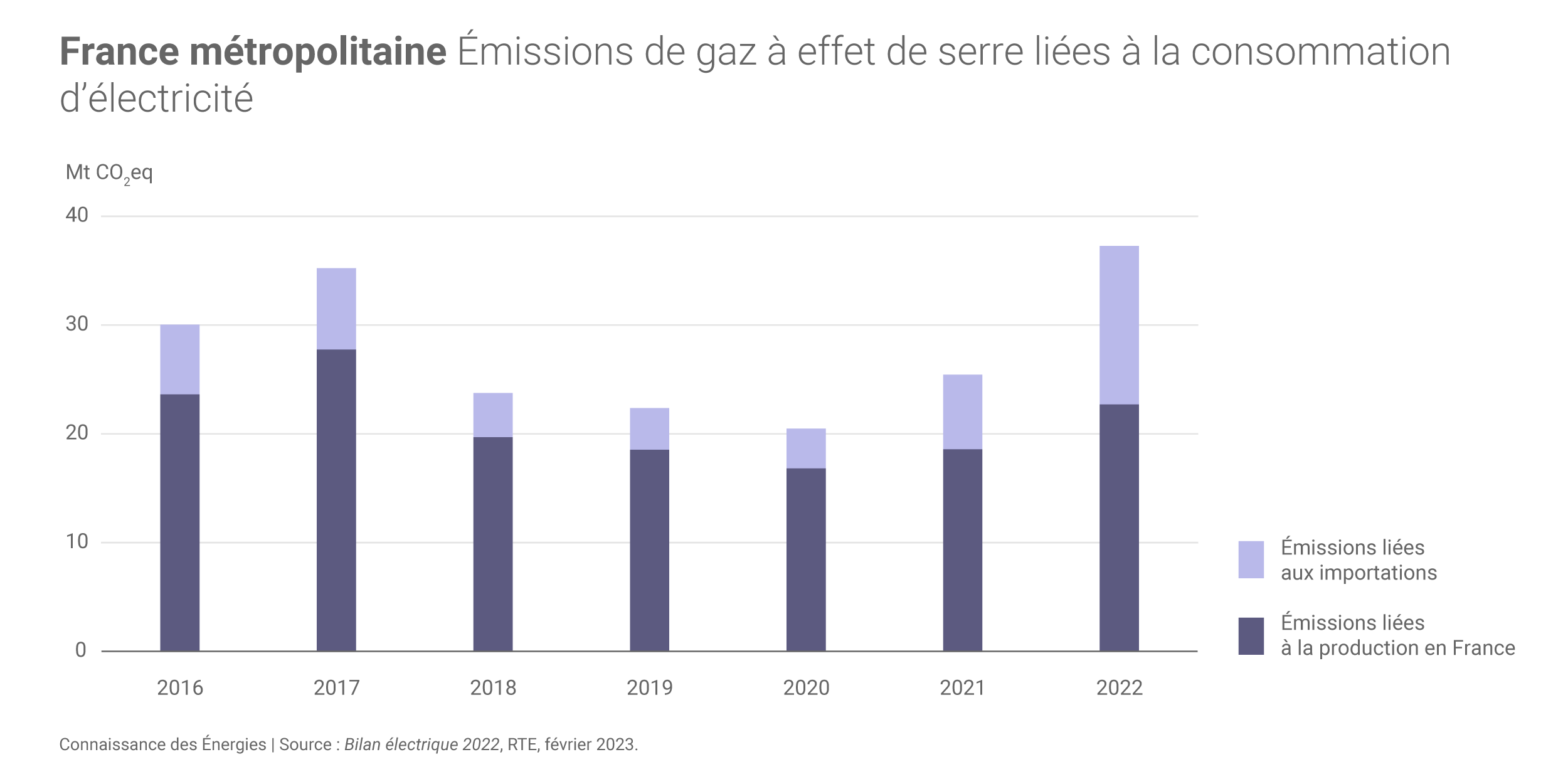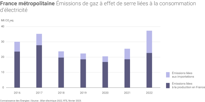 Précisons que celles liées à la production d'électricité ont augmenté, avoisinant 25 Mt équivalent CO2 en 2022 (contre 21,5 Mt éq.CO2 en 2021) en raison du recours plus fréquent aux centrales à gaz.
