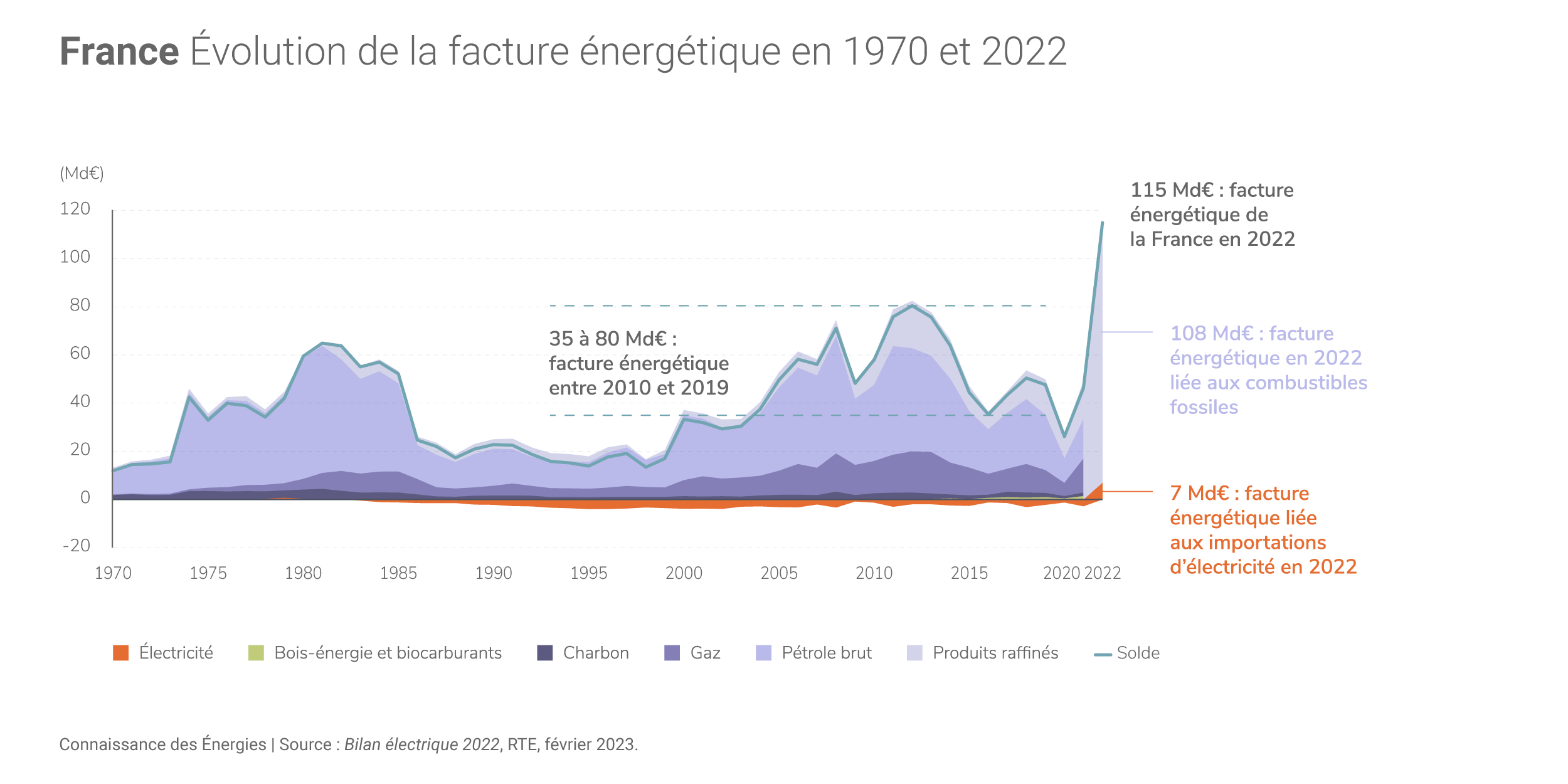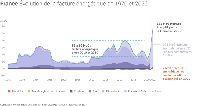 La facture énergétique de la France s'est considérablement alourdie en 2022, atteignant 115 milliards d'euros (soit environ 70 milliards d'euros de plus qu'en 2021) mais les importations d'électricité n'ont pesé « que » pour près de 7 milliards d'euros sur cette facture en 2022 (alors que le solde exportateur net d'électricité de la France lui rapportait en moyenne 2 milliards d'euros par an sur la période 2014-2019).