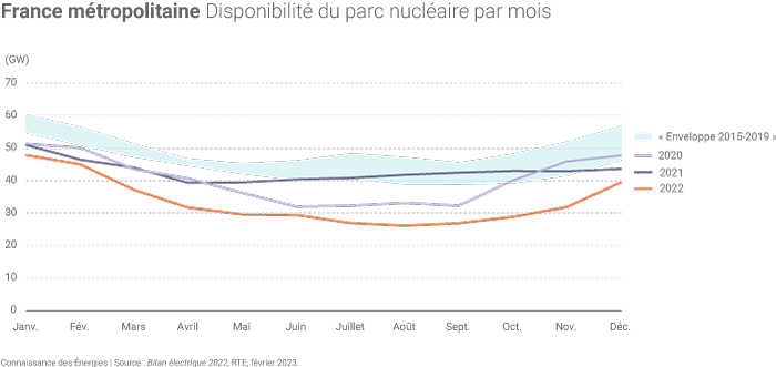 - la production du parc nucléaire a reculé de 82 TWh du fait d'une moindre disponibilité de ses réacteurs (disponibilité de 54% en moyenne en 2022, contre 73% en moyenne entre 2015 et 2019), elle-même liée aux arrêts pour maintenances (ces indisponibilités se sont ajoutées à un planning d’opérations initialement chargé et davantage densifié du fait des décalages induits par la gestion de la crise sanitaire) et en raison du phénomène de corrosion sous contrainte au sein de plusieurs réacteurs. Le niveau de production du parc nucléaire « affiche un recul de 30% par rapport à celui des vingt dernières années », précise RTE ;