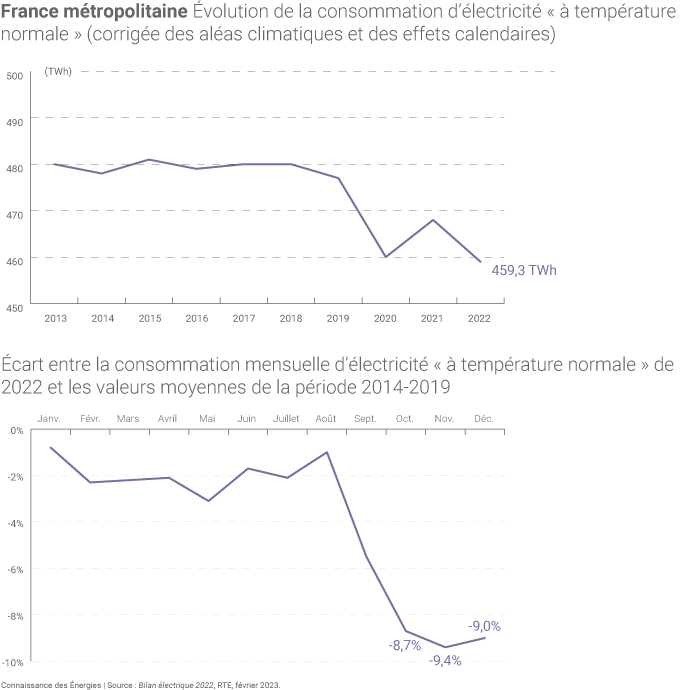En 2022, la consommation brute d’électricité en France métropolitaine a atteint 452,8 TWh, soit près de 4 % de moins qu'en 2021. RTE communique volontiers sur la consommation nationale « à température normale » (c'est-à-dire corrigée des aléas climatiques et des effets calendaires) : celle-ci s'est élevée en 2022 à 459,3 TWh, soit une baisse de 1,7% par rapport à 2021.