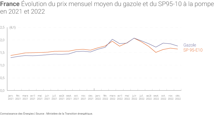 En 2022, les prix du gazole et du SP95-E10 à la pompe ont respectivement atteint en moyenne 1,85 €/l (contre 1,43 €/l en 2021, soit une hausse des prix à la pompe de presque 30% malgré les aides) et 1,77 €/l (contre 1,53 €/l en 2021, soit une hausse de plus de 15%) en France.
