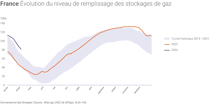 La campagne d'injection dans les stockages français avait ainsi commencé en 2022 avec un mois d'avance sur les années précédentes. Un niveau de remplissage de 100% des stocks a été atteint en début d'hiver en France et des réinjections ont eu lieu en pleine campagne de soutirage en décembre 2022, précise GRTgaz. « Sauf événement climatique extraordinaire », le niveau de stockage à la fin de l'hiver restera ainsi plus élevé que les années précédentes (potentiellement autour de 40%, contre 57% à l'heure actuelle), indique Thierry Trouvé.