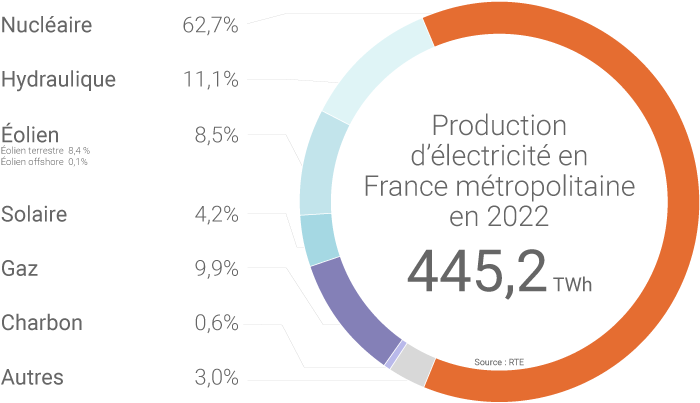 Malgré ces évolutions, la production électrique en France métropolitaine a encore reposé en 2022 à près de 62,7% sur le nucléaire (contre 69% en 2021) et à 11,1% sur l'hydroélectricité. Le gaz (9,9% du mix électrique en 2022) a par ailleurs dépassé l'éolien (8,5%) comme 3e source d'électricité en France.