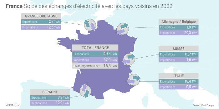 En 2022, la France a importé plus d'électricité qu'elle en a exporté pour la première fois depuis l'année 1980, « avec un solde importateur net de 16,5 TWh, ce qui représente un peu moins de 4 % de la consommation nationale d’électricité ». Le solde des échanges « s’est creusé en particulier pendant l’été, période durant laquelle la France est habituellement fortement exportatrice : les mois de juillet, août et septembre ont représenté à eux seuls 60% du solde négatif », en raison de la moindre disponibilité des parcs nucléaire et hydraulique.