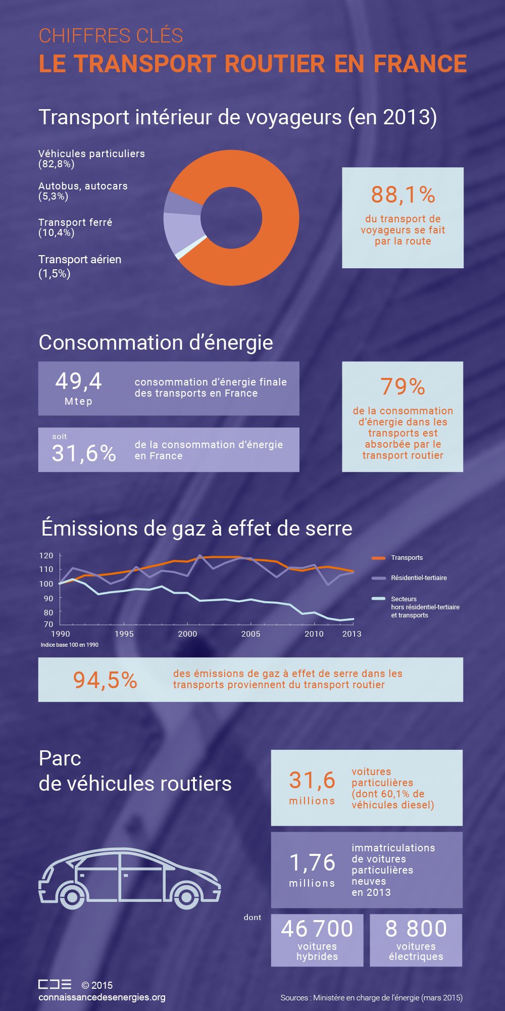 En France, les transports sont responsables de l’émission de 129,8 millions de tonnes équivalent CO2 en 2013 (dont 122,6 millions de tonnes pour le seul transport routier), soit près de 27% des émissions françaises de gaz à effet de serre (GES). Il s’agit du secteur le plus émetteur de GES devant l’agriculture. Les émissions provenant des transports sont en légère baisse depuis 2004 mais elles ont en moyenne augmenté de 0,4% par an sur la période 1990-2013.