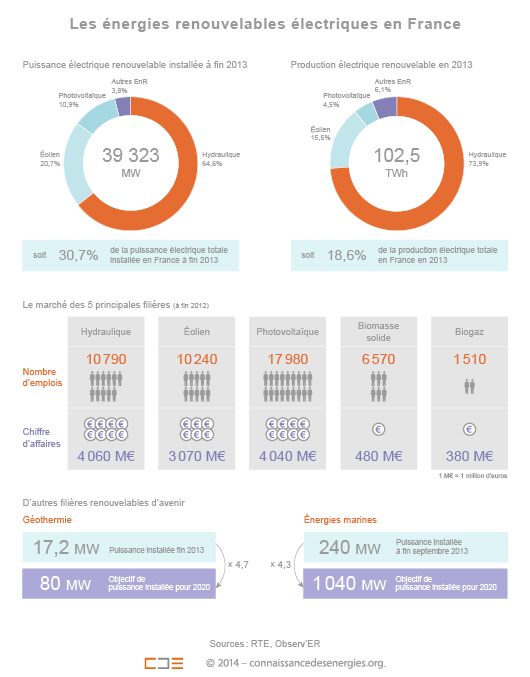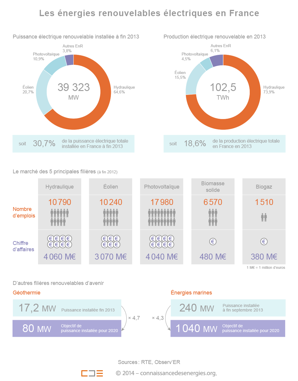 Le solaire photovoltaïque connait un ralentissement encore plus marqué bien que le nombre d’installations raccordées continue d’augmenter (325 225 à fin mars 2014 selon les données ministérielles). Nous vous restituons ci-dessous sous forme d’infographie les chiffres clés des EnR électriques (puissance, production, données socio-économiques) en France.