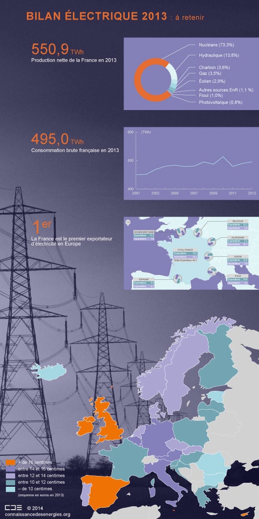 La production électrique nette de la France (550,9 TWh) a augmenté de 1,7% par rapport à 2012. Les énergies renouvelables progressent dans le mix électrique : elles ont généré 18,6% de la production électrique totale en 2013, mais encore seulement 4,8% hors hydraulique. La production du parc nucléaire français, relativement stable, a généré 73,3% de la production française l’année passée. Pour rappel, François Hollande s’est engagé à réduire cette part à 50% d’ici à 2025.