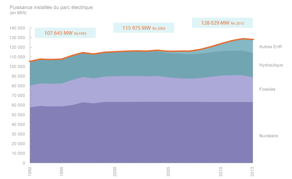 La puissance du parc nucléaire a pour sa part très peu évolué ces 15 dernières années. Ses 58 réacteurs répartis entre 19 centrales ont, à fin 2013, une capacité cumulée de 63 130 MW, soit presque la moitié de la puissance de l’ensemble du parc électrique français. Rappelons que chaque mégawatt a une production électrique variable selon le facteur de charge de l’unité de production.