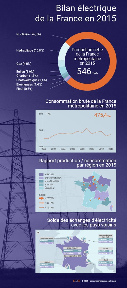 La consommation d’électricité en France métropolitaine s’est élevée à 475,4 TWh en 2015, soit 2,2% de plus qu’en 2014. Cette hausse est principalement liée aux températures en moyenne plus fraîches en début d’année (entraînant un recours accru au chauffage) et plus chaudes en été (augmentant les besoins de froid). En « corrigeant » cette consommation de l’aléa climatique, RTE indique que la consommation française a seulement augmenté de 0,5% en 2015 (475,4 TWh, niveau similaire à celui de 2013).