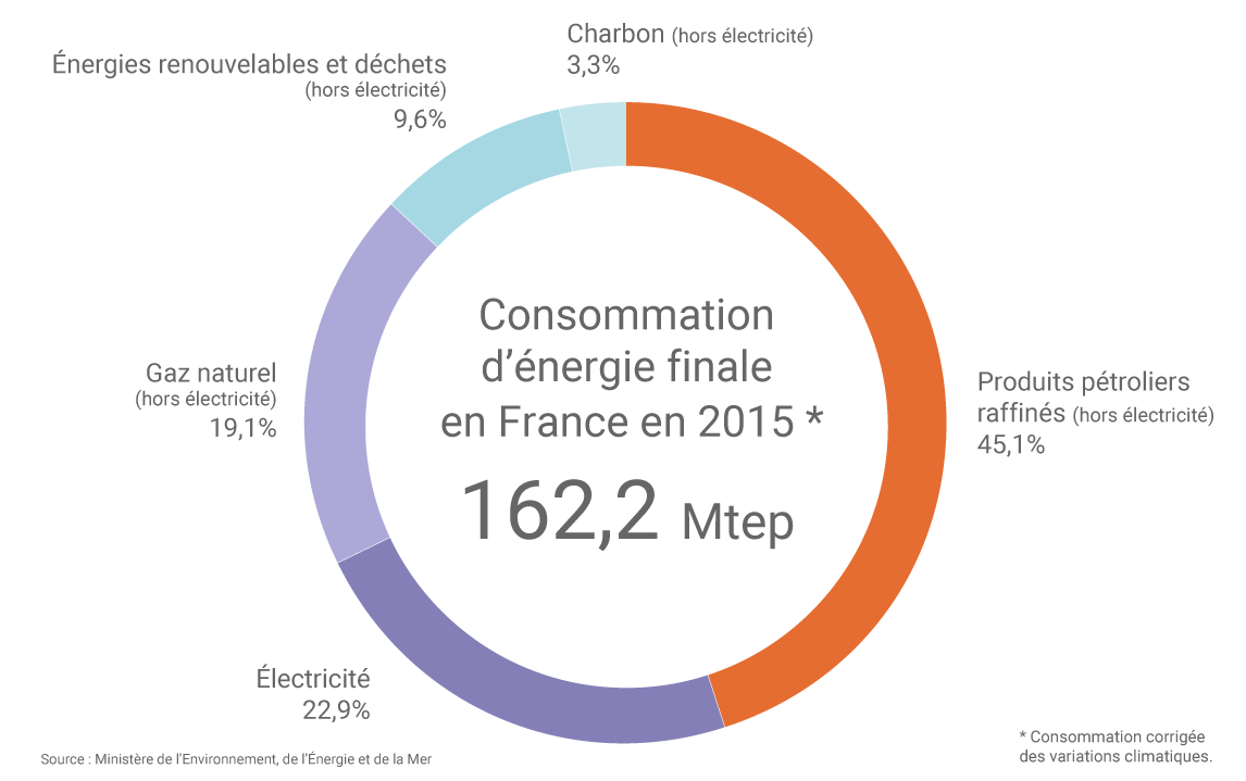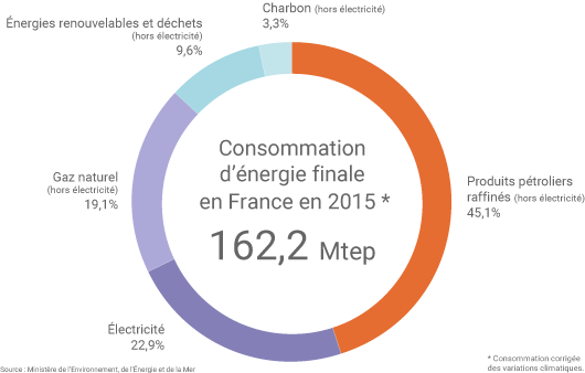 Le secteur résidentiel-tertiaire (bâtiments) a compté à lui seul pour 45% de la consommation d’énergie finale en France en 2015. Suivent les secteurs des transports (33,1% de la consommation française d’énergie finale) et de l’industrie (15,8%). Depuis 1992, les consommations d'énergie des secteurs des transports et des bâtiments ont respectivement augmenté de 15,1% et 10,4% tandis que celle de l’industrie a été réduite d’un quart.