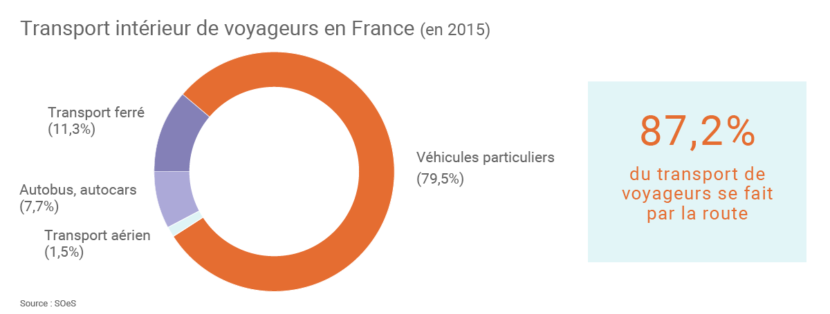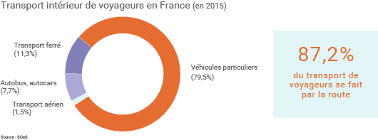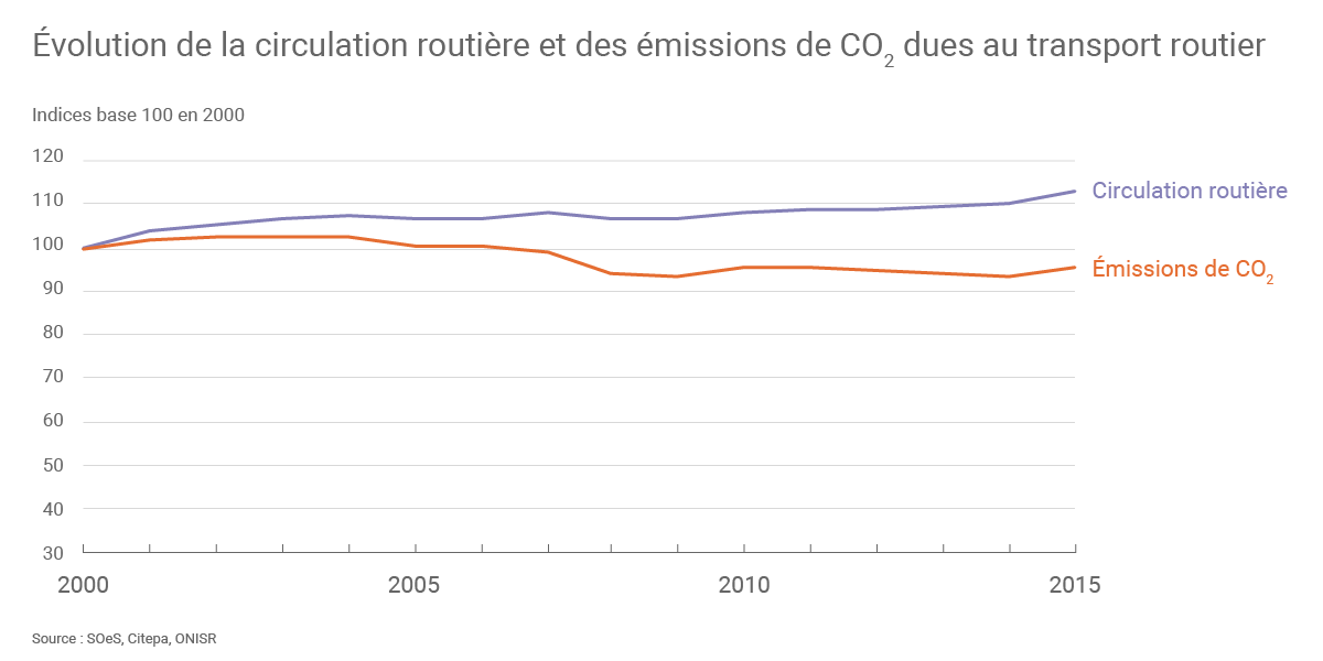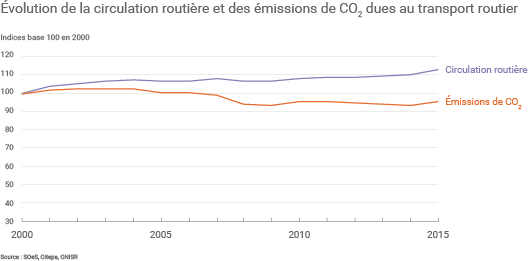 Les émissions de gaz à effet de serre dues aux transports en France ont augmenté de 0,9%. Cette hausse - la première depuis 2004. Cette accélération est essentiellement due à la hausse du transport en véhicules particuliers (+2,4%) qui compte pour 79,5% de l’ensemble des déplacements de voyageurs en France. Cette hausse a entre autres été stimulée par la baisse des prix à la pompe, liée à la chute des cours du pétrole.