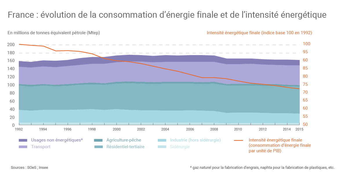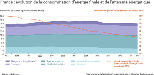 L’intensité énergétique finale de la France, c’est-à-dire la consommation nationale d’énergie finale par unité de PIB, a pour sa part diminué de plus de 27% entre 1992 et 2015.