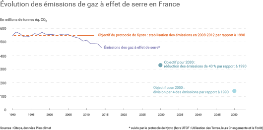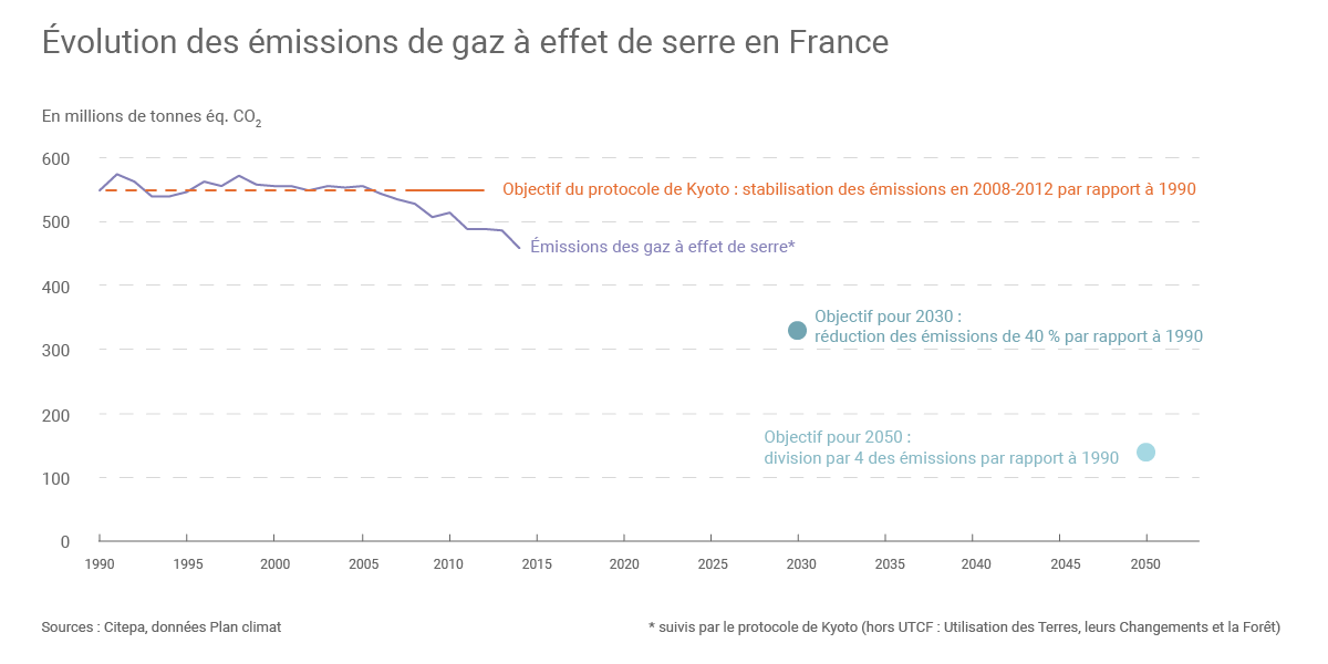 La France s’est engagée à baisser ses émissions de gaz à effet de serre de 40% d’ici à 2030 par rapport au niveau de 1990 et a inscrit l’objectif « facteur 4 » (division par 4 des émissions à l’horizon 2050 par rapport à 1990) dans la loi de transition énergétique pour la croissance verte adoptée à l’été 2015.