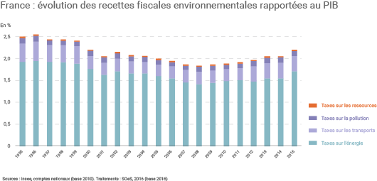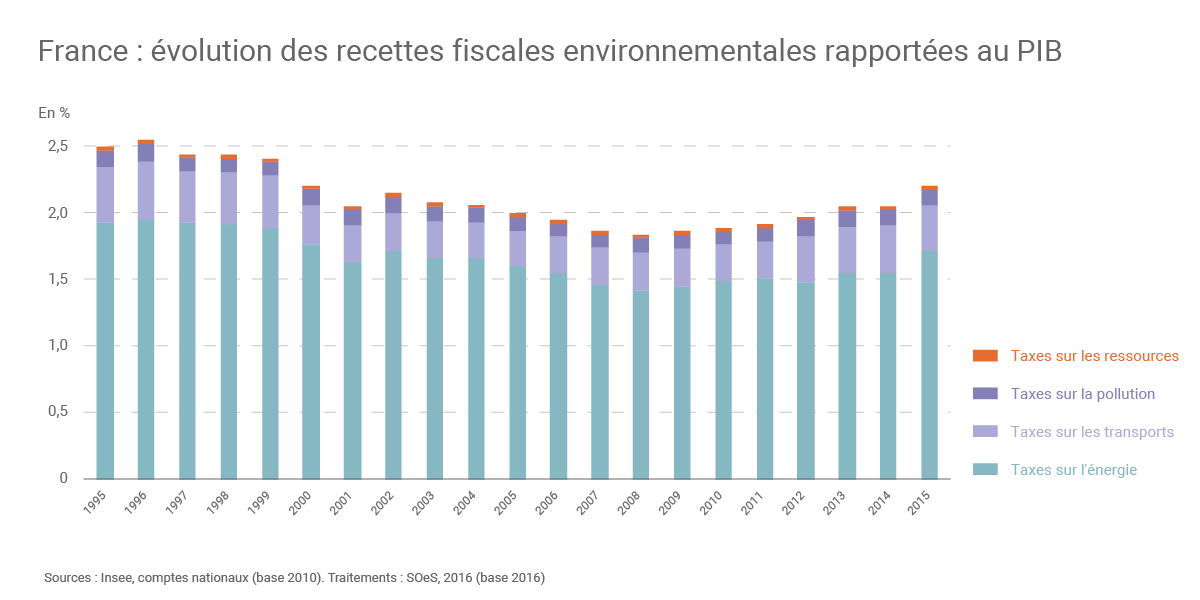 En matière de recettes fiscales, le produit des taxes « environnementales » collectées en France en 2015 aurait atteint 47,7 milliards d’euros, soit près de 2,2% du PIB national. Plus de 78% de ces recettes proviennent des taxes sur l’énergie (TICPE, CSPE, etc.).