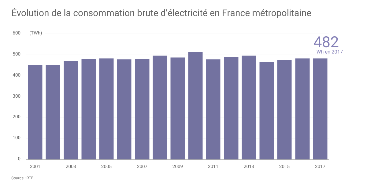La consommation d’électricité brute en France métropolitaine a atteint 482 TWh en 2017, soit 0,3% de moins qu’en 2016. Cette diminution est liée à des températures moyennes plus clémentes (+ 0,6°C par rapport à 2016) et au fait que l’année 2016 était bissextile. « Corrigée de l’aléa climatique et des effets calendaires », la consommation française d’électricité est restée stable l'an dernier pour la 7e année consécutive.