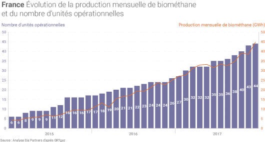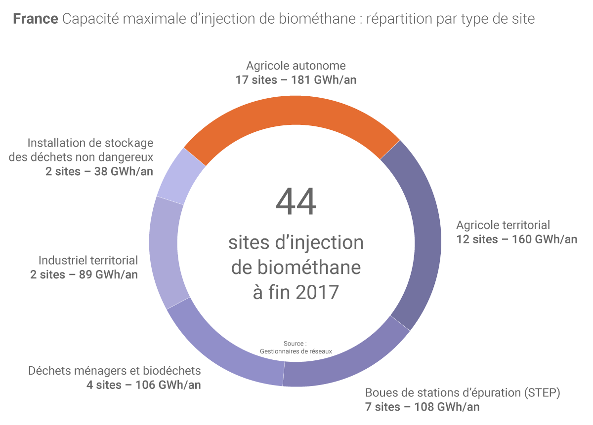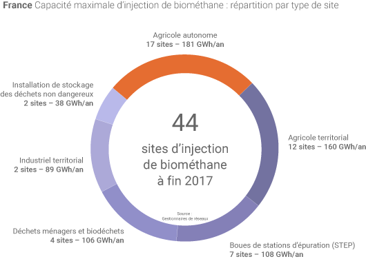 En 2017, près de 408 GWh de biométhane ont été injectés sur les réseaux gaziers en France, soit près du double de 2016 selon GRTgaz. A fin 2017, 44 sites de production étaient en service (à 60% en milieu agricole) et le niveau d'injection reste faible par rapport à la consommation nationale (465 TWh sur le périmètre de GRTgaz) mais 361 projets sont actuellement à l’étude. Sur les 592 sites produisant du biogaz en France à fin 2017, 44 l’ont valorisé sous forme de biométhane injecté sur les réseaux de gaz naturel.