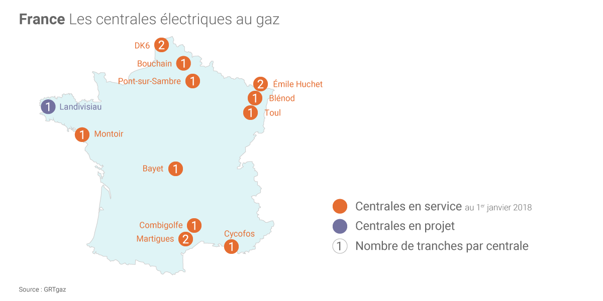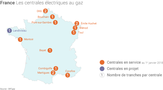 La France compte actuellement «14 tranches de cycles combinés à gaz raccordées au réseau de GRTgaz », une centrale supplémentaire étant en projet à Landivisiau en Bretagne, rappelle GRTgaz. Ces centrales ont été davantage sollicitées en 2017 pour compenser l'indisponibilité de tranches nucléaires l’hiver dernier (avec 15 jours très froids notamment en janvier) et la baisse de la production hydroélectrique.