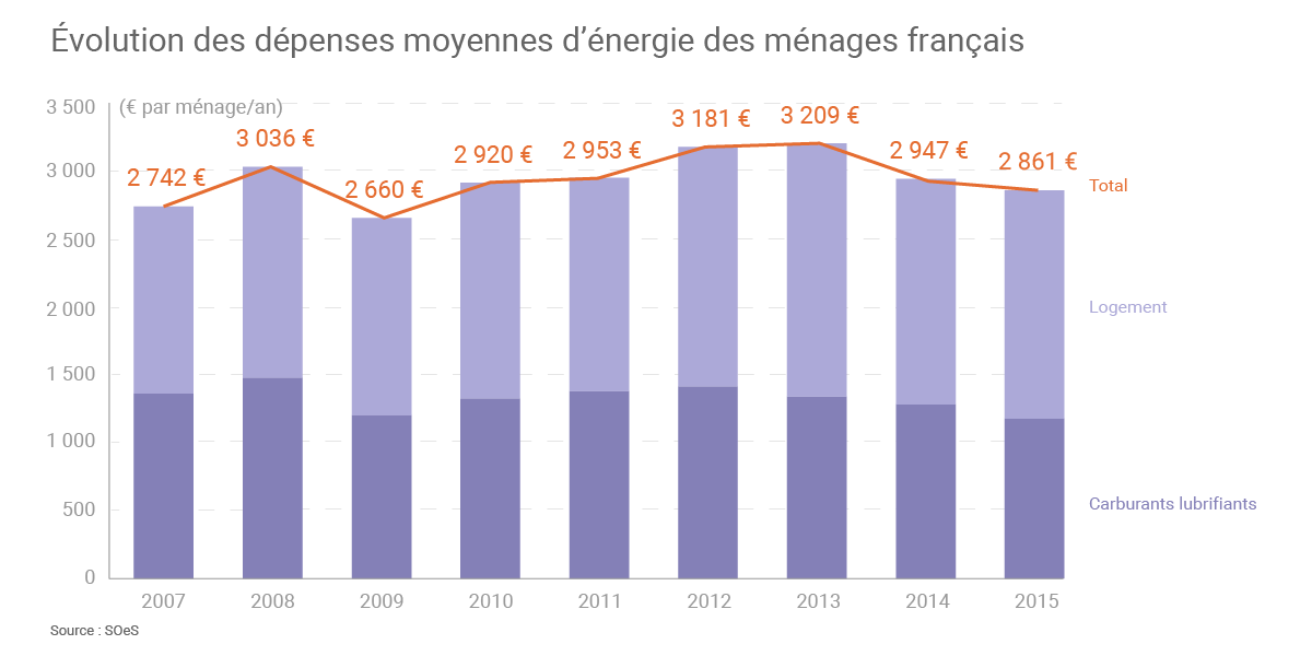 En 2015, un ménage français a consacré en moyenne 140 euros par mois aux dépenses d’énergie dans son logement et 98 euros par mois à l’achat de carburants. (©Connaissance des Énergies, d'après SOeS)