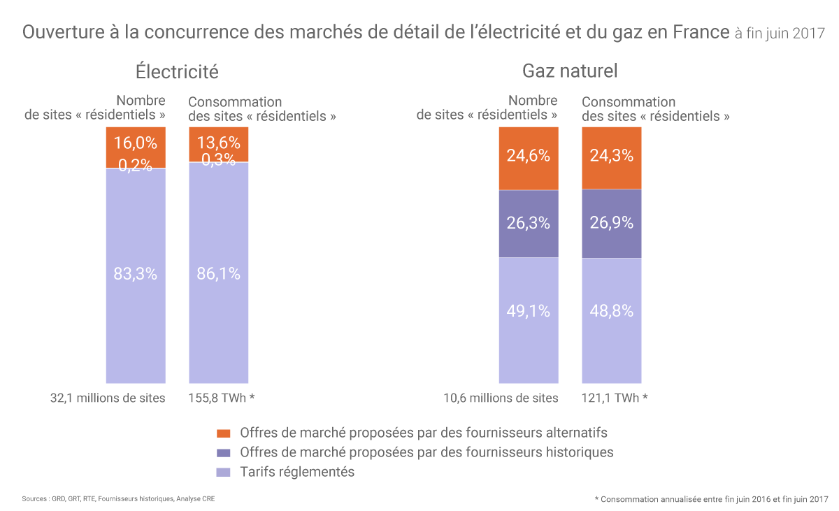 Depuis juillet 2007, tous les consommateurs français ont la possibilité de souscrire une offre dite « de marché » (dont le prix est librement fixé par contrat), que ce soit auprès d’un fournisseur « historique » (principalement EDF pour l’électricité et Engie pour le gaz mais aussi les « ELD » implantées localement) ou auprès d’un autre fournisseur dit « alternatif ».