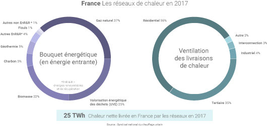 À fin 2017, la France comptait 761 réseaux de chaleur, d’une longueur cumulée de 5 397 km. Ceux-ci desservent en grande majorité des bâtiments résidentiels et tertiaires (91% de la chaleur livrée) : près de 32 212 bâtiments en France sont raccordés à un réseau de chaleur, soit « 2,4 millions équivalents logements ». Au total, 25 TWh de chaleur ont été délivrés en 2017 par l’intermédiaire de ces réseaux.