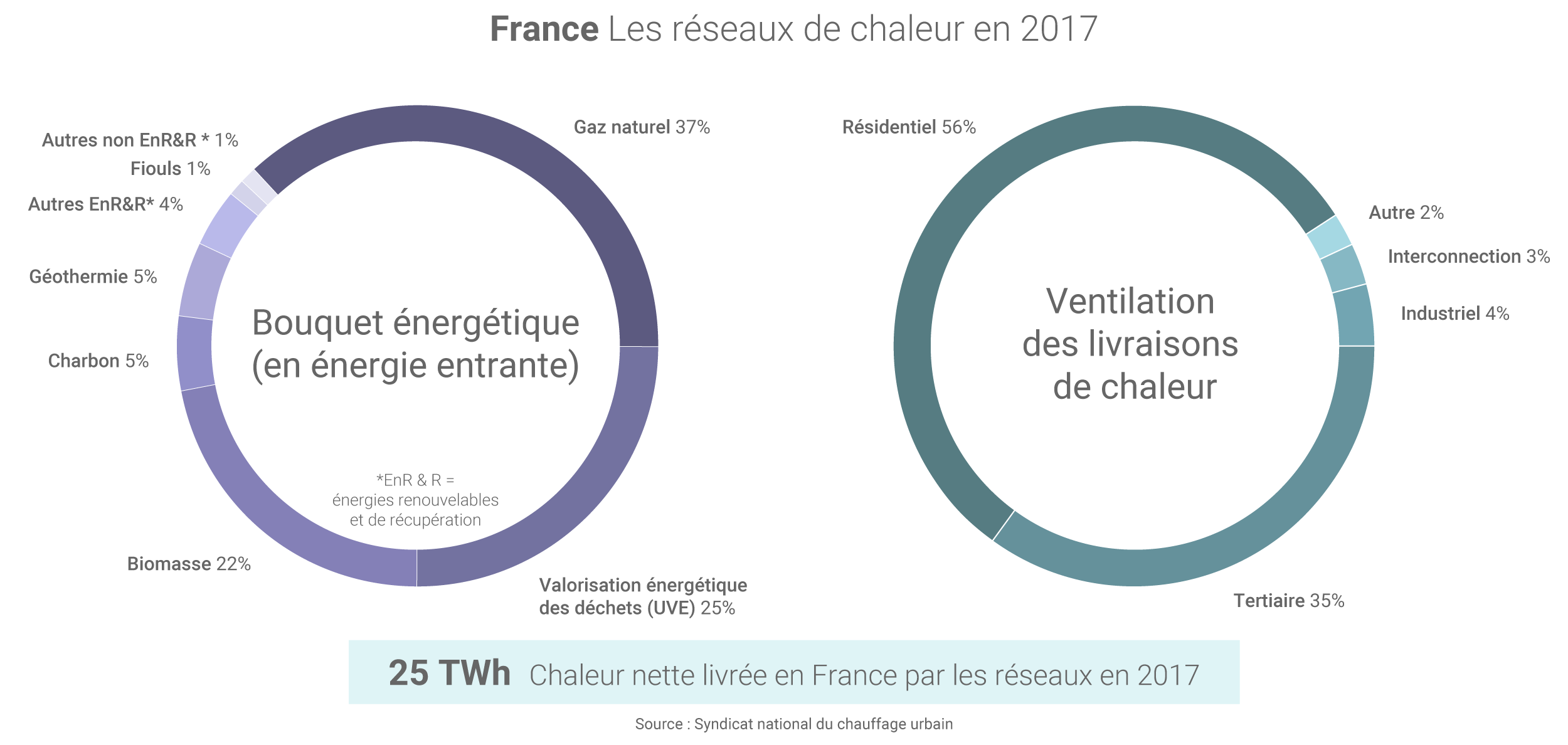 En matière de bouquet énergétique, le gaz naturel reste la principale énergie « entrante » dans les réseaux de chaleur français (37% en 2017) mais la part des énergies renouvelables (biomasse, géothermie, etc.) et de récupération (chaleur issue de la valorisation énergétique de déchets, de process industriels, de data centers, etc.), dites « EnR&R », a fortement augmenté, atteignant 56% en 2017 (contre 27% il y a 10 ans).