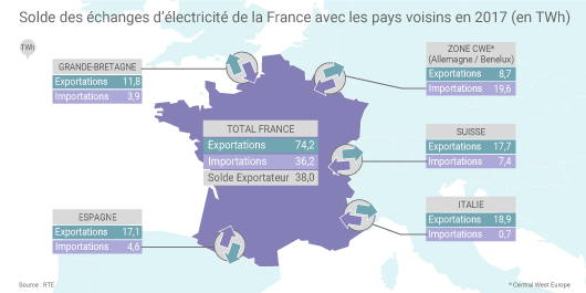La moindre disponibilité des centrales nucléaires françaises début 2017 a conduit à augmenter les importations françaises d’électricité, qui se sont élevées à 36,2 TWh l’an dernier. Le solde exportations-importations de la France est resté largement positif en 2017 (de 38 TWh) mais a « atteint son niveau le moins élevé depuis 2010 » selon RTE.