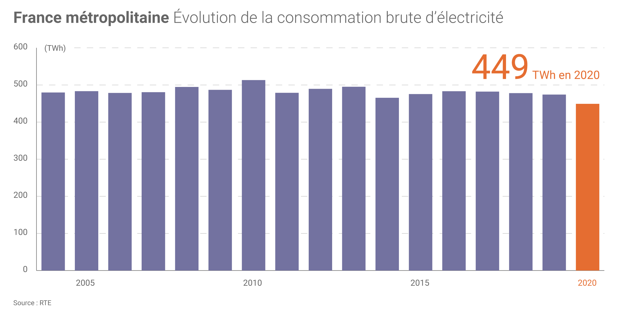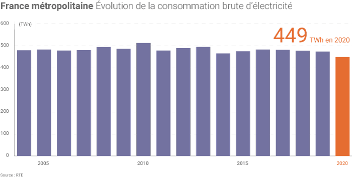 En 2020, la consommation brute d’électricité en France métropolitaine s’est élevée à 449 TWh, soit 5,1% de moins qu’en 2019. Cette chute de la consommation est « à la fois imputable à la crise sanitaire et à des températures globalement plus douces » (+ 0,97°C par rapport à la « température moyenne de référence), précise RTE. . Corrigée des aléas climatiques, la consommation française d’électricité aurait baissé de 3,5% en 2020 par rapport à 2019 selon RTE.