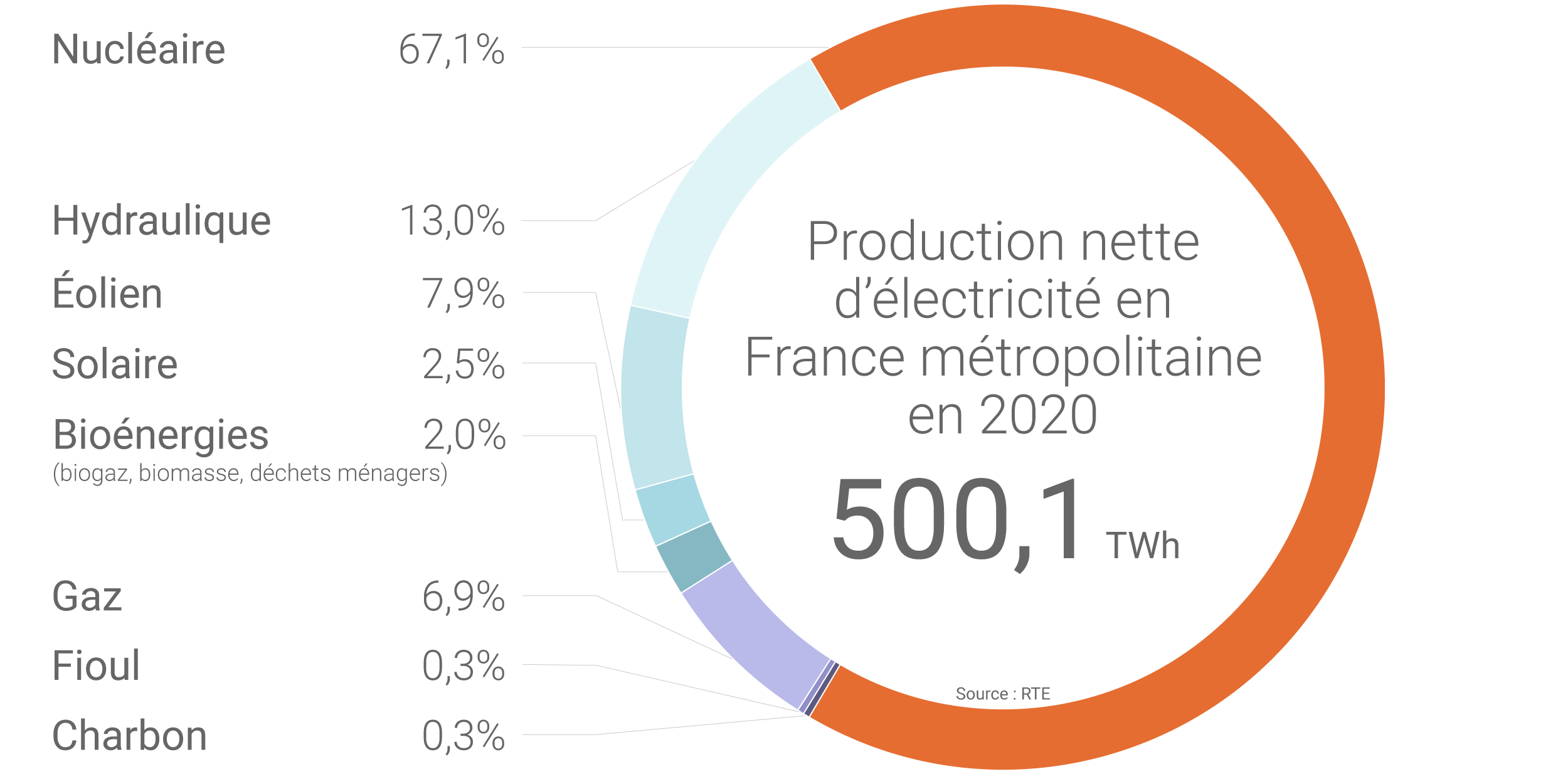 L’énergie nucléaire a compté pour 67,1% de la production totale d’électricité en France métropolitaine en 2020 mais la filière a connu un « recul historique », générant 11,6% d’électricité en moins qu’en 2019 (335,4 TWh en 2020, plus bas niveau de production depuis 1993).