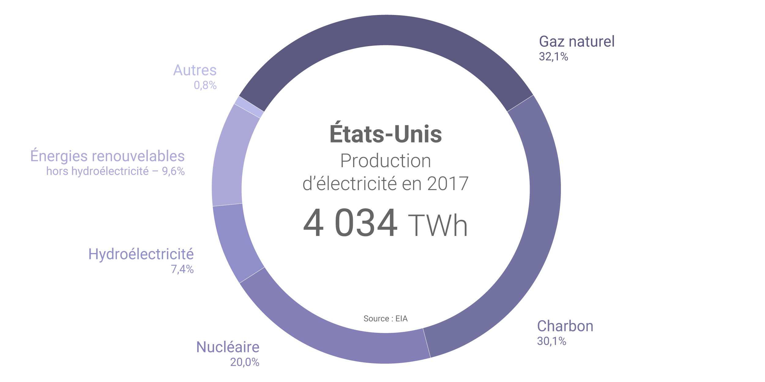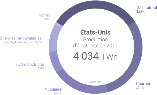 À eux seuls, le charbon et le gaz naturel ont compté pour plus de 62% de la production américaine d’électricité en 2017. Au cours de la dernière décennie, la production électrique à partir de charbon aux États-Unis a diminué de 40% mais la part de ce combustible dans le mix électrique américain dépassait encore 30% en 2017 (contre près de 49% en 2007). Durant cette période, le gaz naturel est devenu la première source d’électricité du pays (32,1% du mix électrique en 2017), grâce au développement de l’exploitation des hydrocarbures non conventionnels.