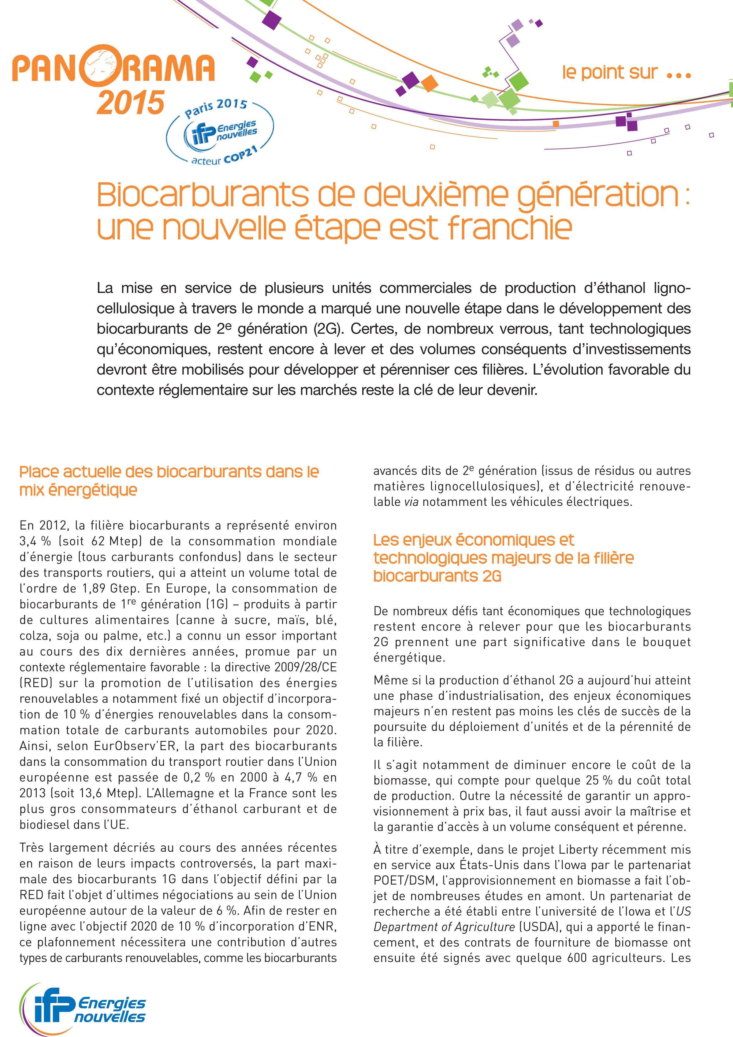 Dans le cadre du Colloque Panorama 2015 d’IFP Energies nouvelles, Charlène Sagnes et Marie-Françoise Chabrelie rappellent les notions de base sur ces biocarburants « 2G » : leurs matières premières, les voies de valorisation (biochimique, thermochimique ou hybride), les projets en cours ainsi que les enjeux économiques et technologiques de la filière.