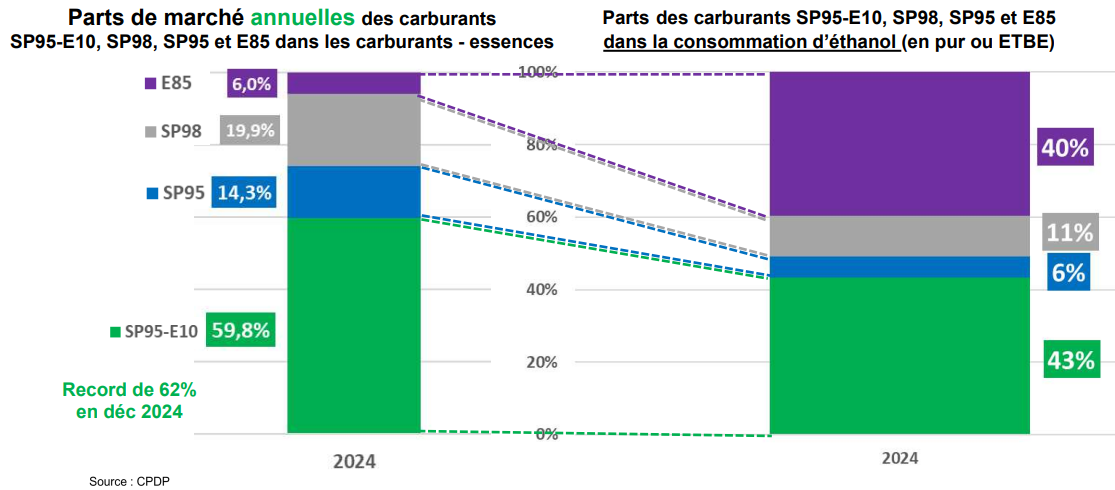 Pour rappel, le bioéthanol est incorporé dans les essences en France, en pur ou sous forme d'un dérivé, jusqu’à 7,5% (dont au maximum 5% d’éthanol pur) dans le SP95 et le SP98, jusqu’à 10% dans le SP95-E10 et jusqu’à 85% dans le Superéthanol-E85. Ce taux d'incorporation de bioéthanol dans l'E85 varie toutefois fortement selon les saisons : il chute autour de 60 à 65% en hiver et une moyenne de 75% est généralement retenue.