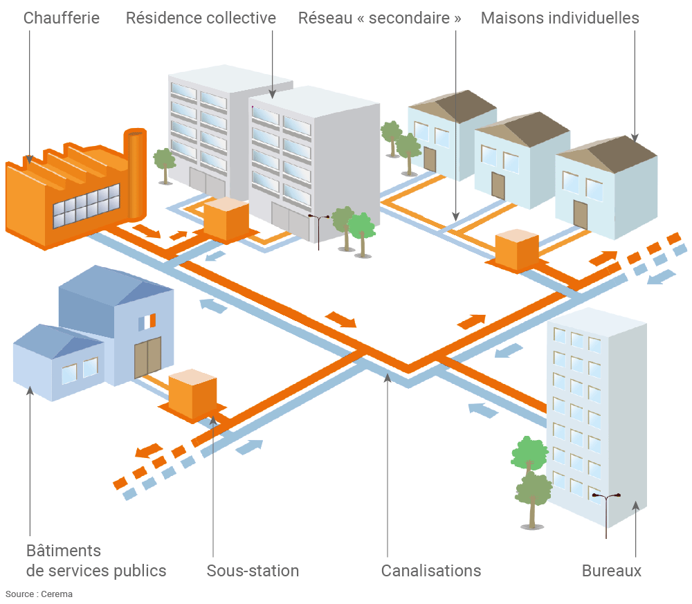 Schéma de principe d'un réseau de chaleur (source : Ademe sur base Cerema)